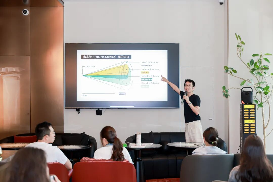 分享会上,胡镔通过一系列引人深思的提问——“你思考的未来通常有多远?”、“未来是单一的,还是多元的?”,引导观众跳出对未来的线性想象,系统性地介绍了未来学这一学科,阐述了从“可能的未来”到“合意的未来”的思维图谱,并强调未来思维是一种可以学习的能力,能帮助我们松动心智、引领变革、行动共创。